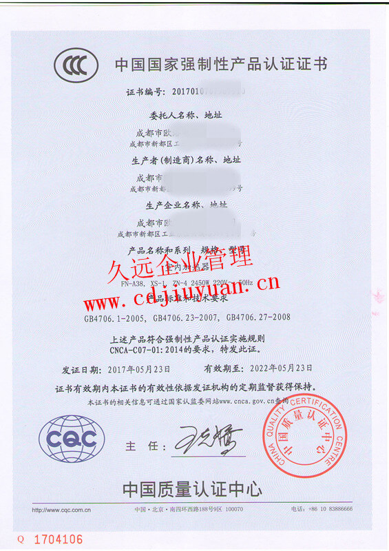 CQC標志產品認證證書